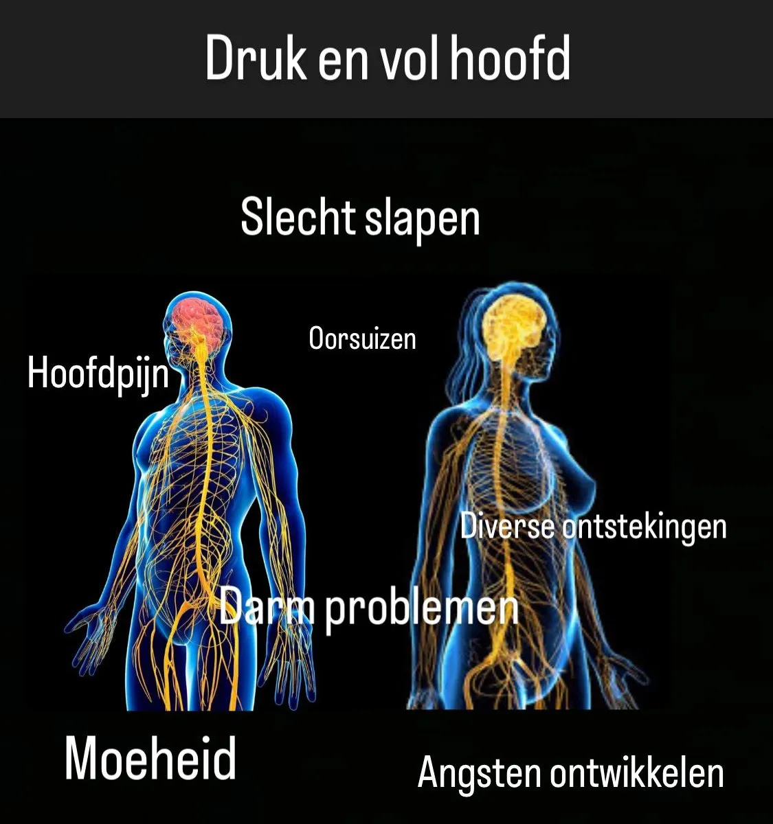 Je lichaam kan enkel in het nu zijn. Je zenuwstelsel behoort je lijf te bedienen, te controleren en te besturen. Het zenuwstelsel kan tijdelijk zwaarder belast worden, maar niet lange periodes aaneensluitend. Dan signaleert je lichaam aan jou, in het dagelijks leven, klachten, zie foto.